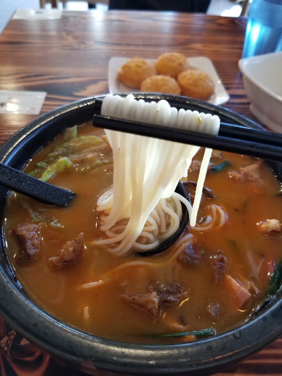 Update: Their open hours are wrong. They close way before 10pm. We arrived around 9:25pm, and they had already locked the front door, having 2 staff standing by it to make sure no customers can enter. This place is really clean and cozy. After a long hard week, we are glad we chose here to have dinner on such a cold day. If you have never tried Yunnan style rice noodle bowl (Chinese version of Pho), you have to come here for the most authentic bowl in this region. The rich but also light broth, the big amount of flavorful proteins, and the tender rice noodles, all together comforted our soul. We also ordered “street food”: the wings and bacon enoki skewers. Both are really hot and delicious. For the large portion they give, we packed half of everything home. The service was fast and professional, and the waitress was nice and warm. They pack your noodles and broth separately for to-gos. By the way, if you want green onion and cilantro in your soup bowl, just tell them as you order.